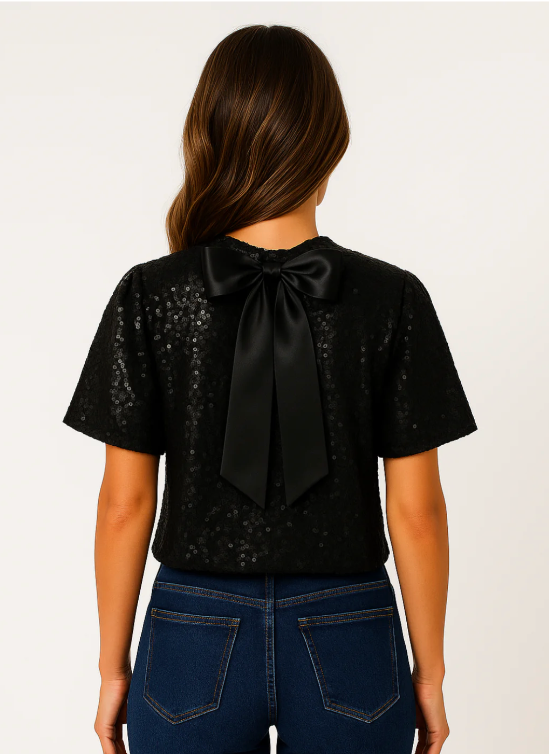 Elevate your evening look with the Kate & Pippa Ava Top, a timeless blend of shimmer and sophistication. This sequin-covered top catches the light beautifully, while the statement satin bow at the back adds an elegant finishing touch. Perfect for pairing with tailored trousers or sleek skirts for special occasions.