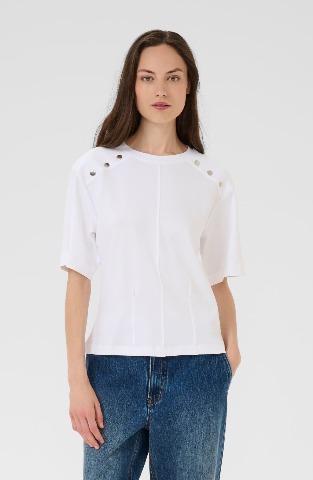 Boxy top with distinctive metal eyelet detail along the shoulder seams. Features a crew neckline, straight hem, and short wide sleeves for a modern silhouette.