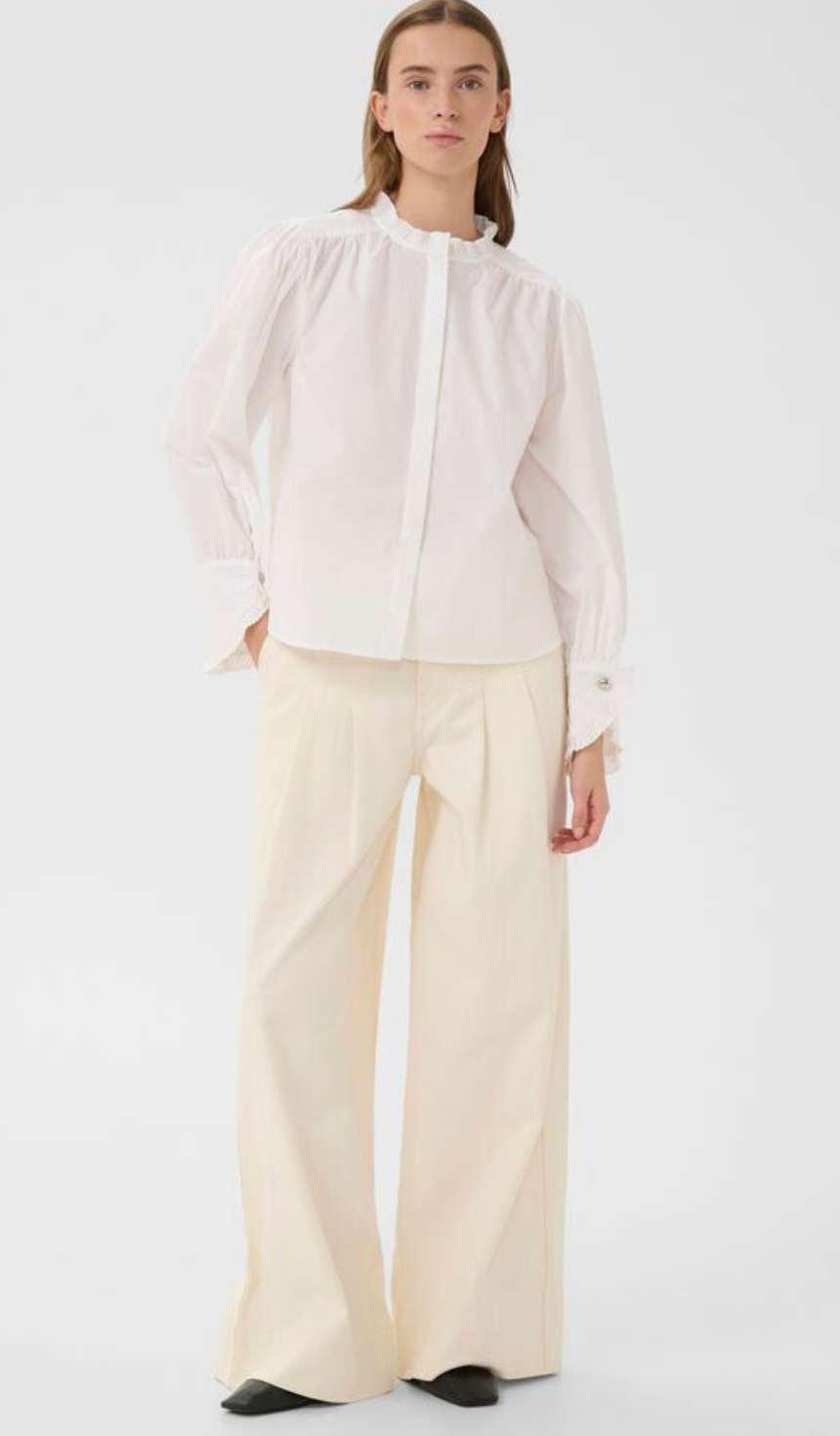 This crisp shirt features a straight fit, refined ruffle-trimmed stand collar, and statement long sleeves with wide buttoned cuffs. Minimal pleating at the shoulder and cuff adds a subtle touch of volume and structure.