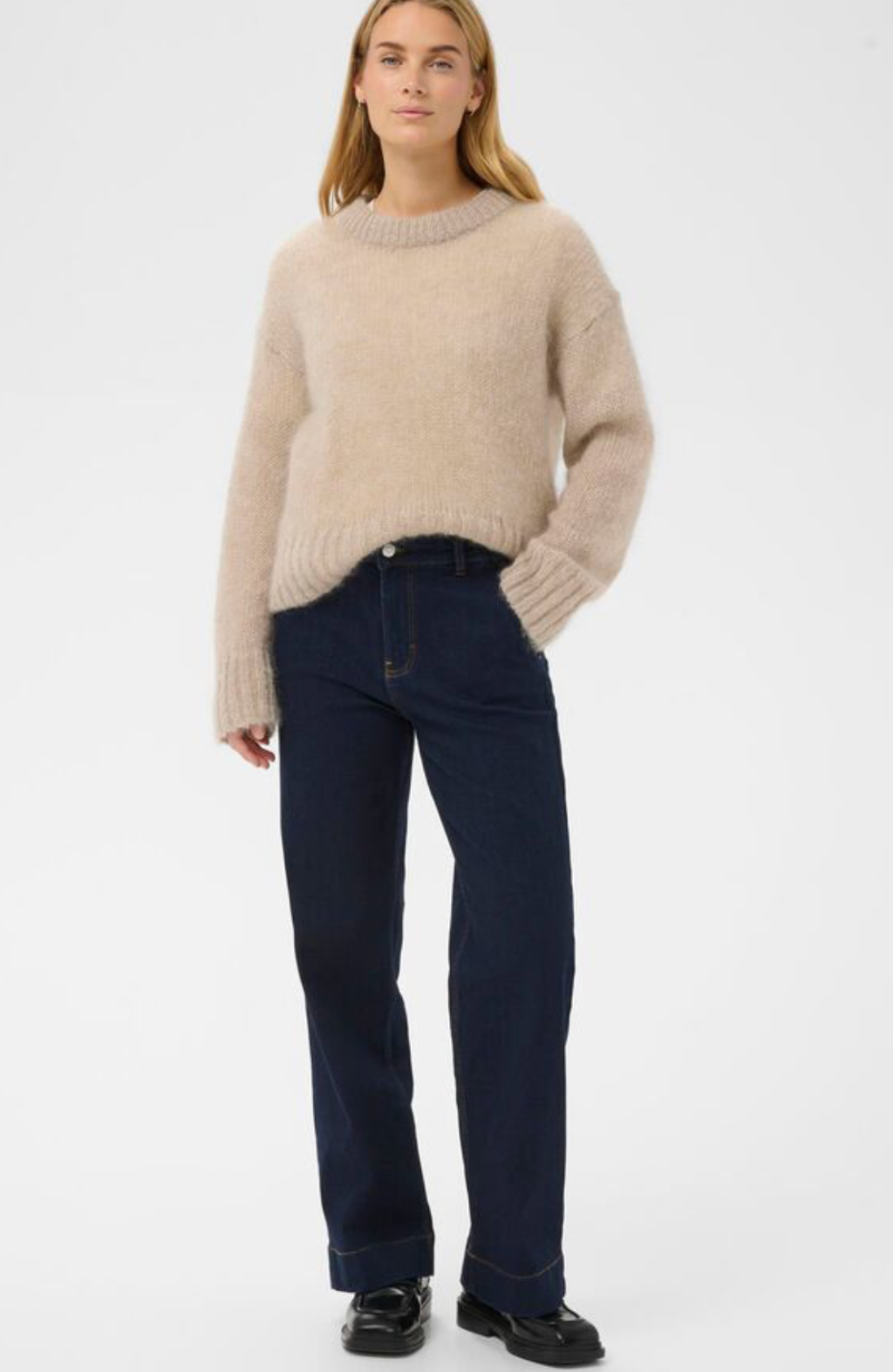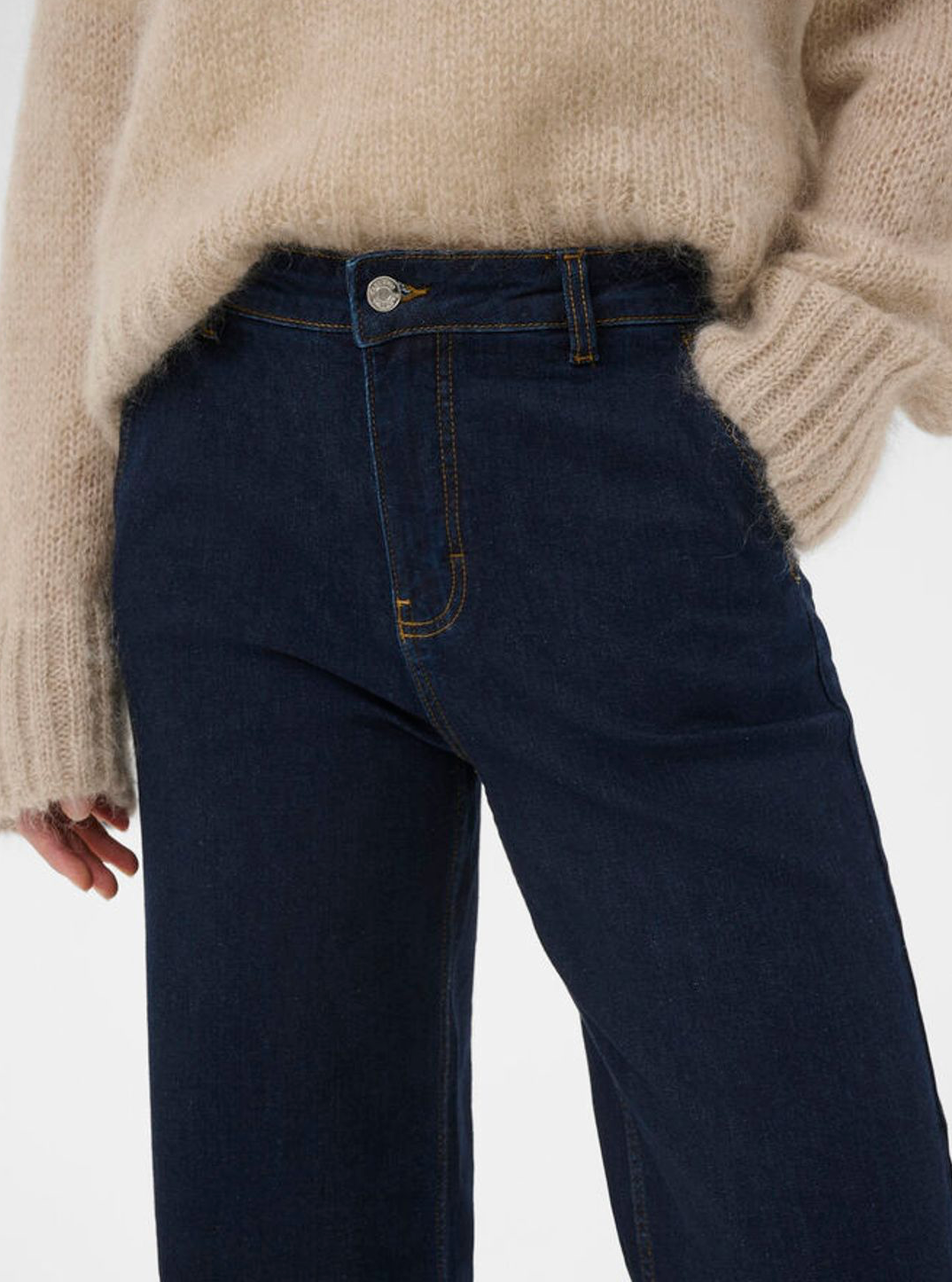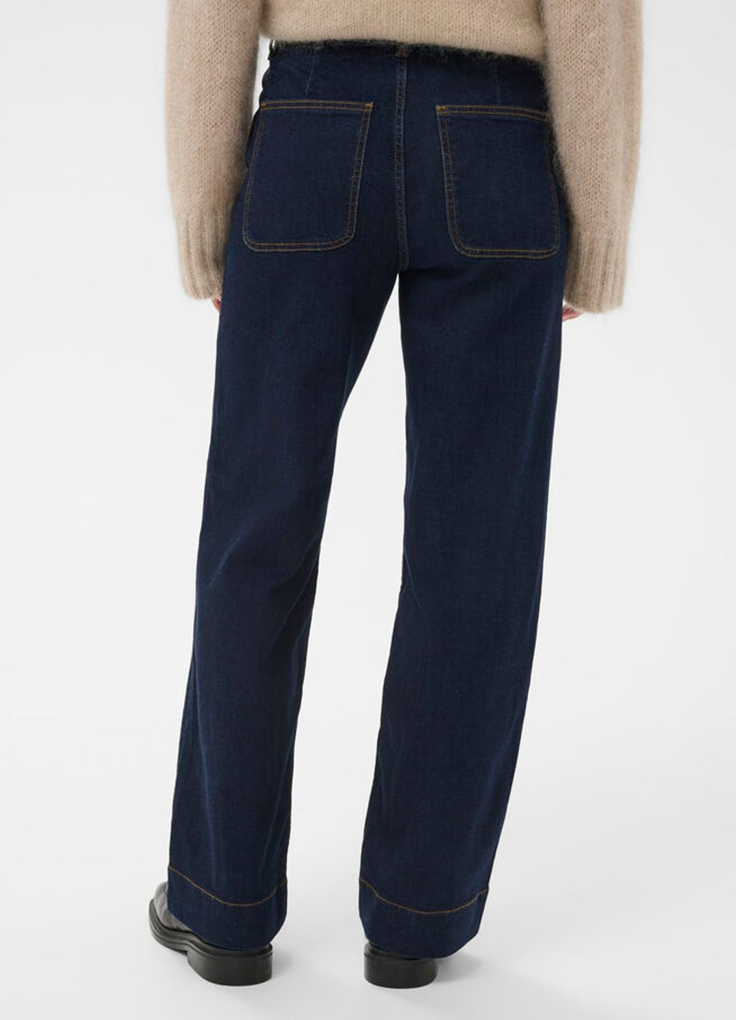 The model is 174 cm tall and wears a size 28. These dark blue denim jeans feature a classic straight leg with turned-up hems and contrast stitching for a relaxed yet thoughtful look. The fit is loose and comfortable – ideal for everyday wear. Style with a knit or shirt for a clean and simple look.