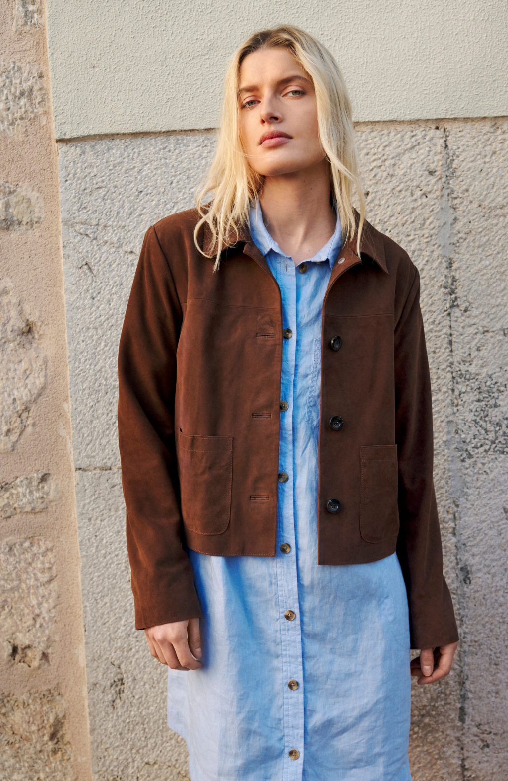 Cropped suede jacket with a boxy silhouette, classic shirt collar and four-button closure. Features front patch pockets and long straight sleeves for a timeless, clean-lined look.