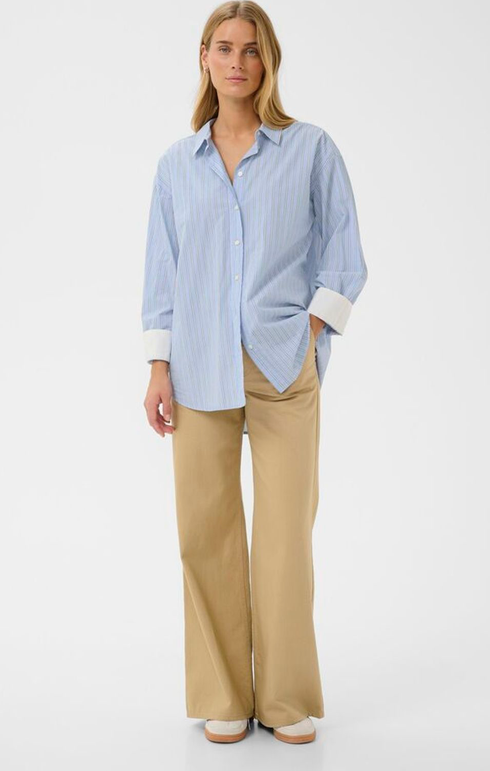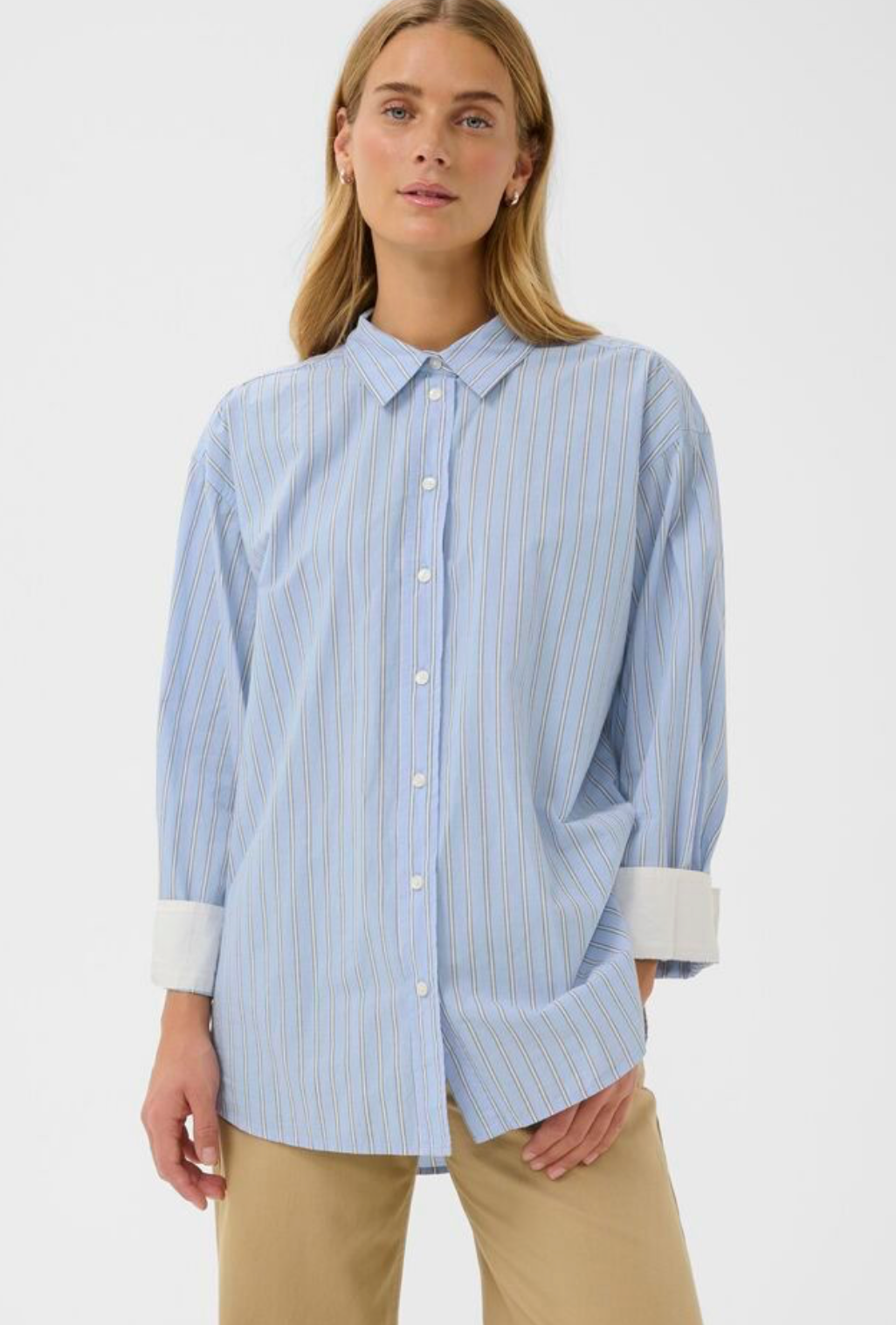 The model is 174 cm tall and wears a size 36. This shirt in pure cotton features a classic cut and a relaxed fit for all-day comfort. The fine stripes and contrast cuffs add a modern twist. Style it with chinos or jeans for an effortlessly stylish look.