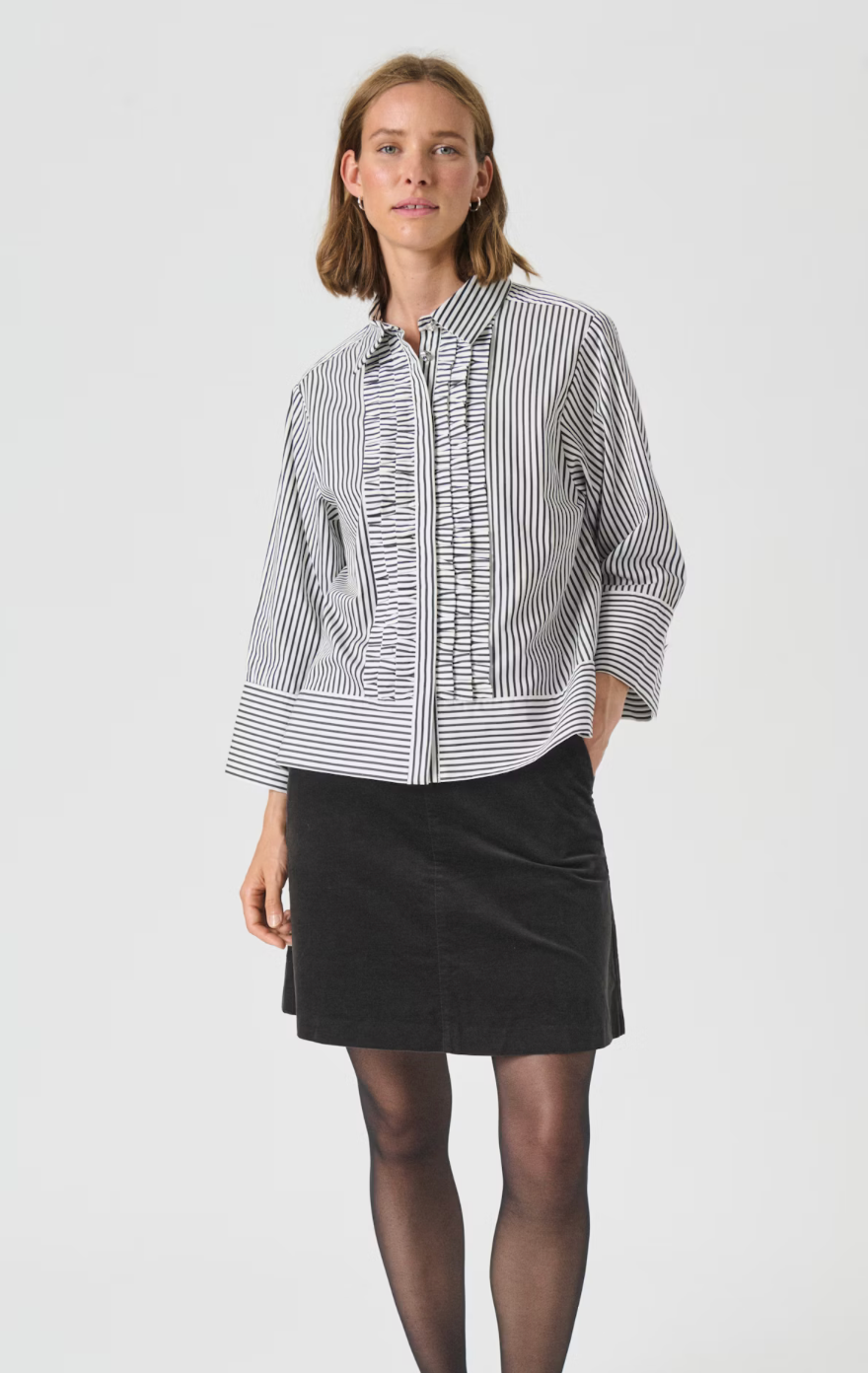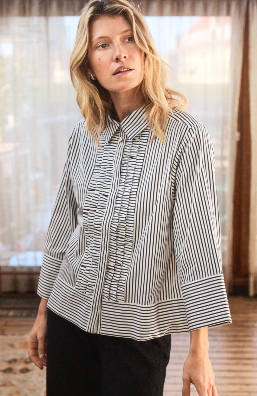The model is 178 cm tall and wears a size 36. This striped shirt features a relaxed fit with wide cuffs and a slightly cropped design. Delicate pleats along the button placket add a feminine touch, while the mix of stripe directions gives a modern and graphic look. Style it with jeans or a simple skirt.