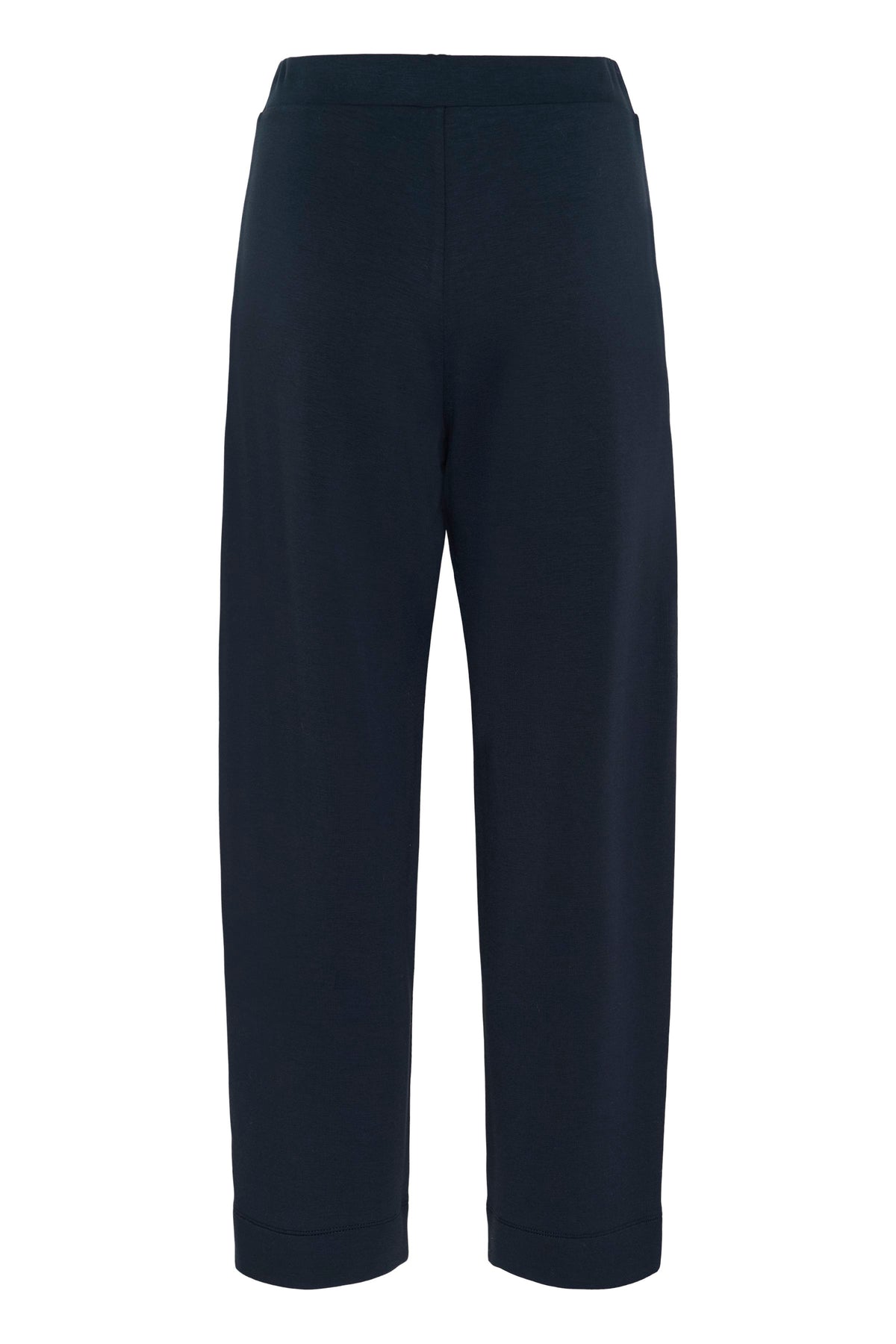 The model is 174 cm tall and wears a size M. These dark navy trousers feature a classic straight fit with pressed creases for an elegant, polished look. The elastic waistband ensures a comfortable fit, while the soft fabric makes them ideal for both work and relaxed days. Style with a shirt or knit depending on the occasion.