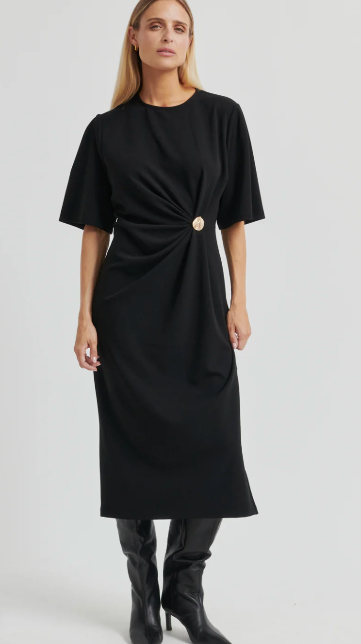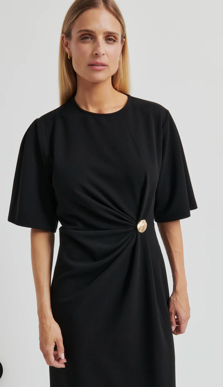 Second Female draped dress. The dress is made in soft fabric with slightly stretchy quality. Featuring a round neck with concelaed zip fastening. Gold detail at waist with draping. Slit at one side. Regular, slightly fitted silhouette.