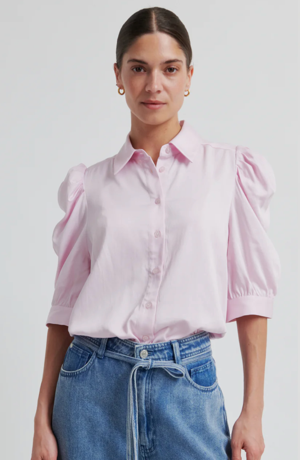 Second Female short-sleeved silky shirt. The shirt is made in a silky-soft, drapy viscose-tencel blend. Featuring a regular collar and button-through fastening. Puffed shoulders and short sleeves with buttoned cuffs. Regular fit.