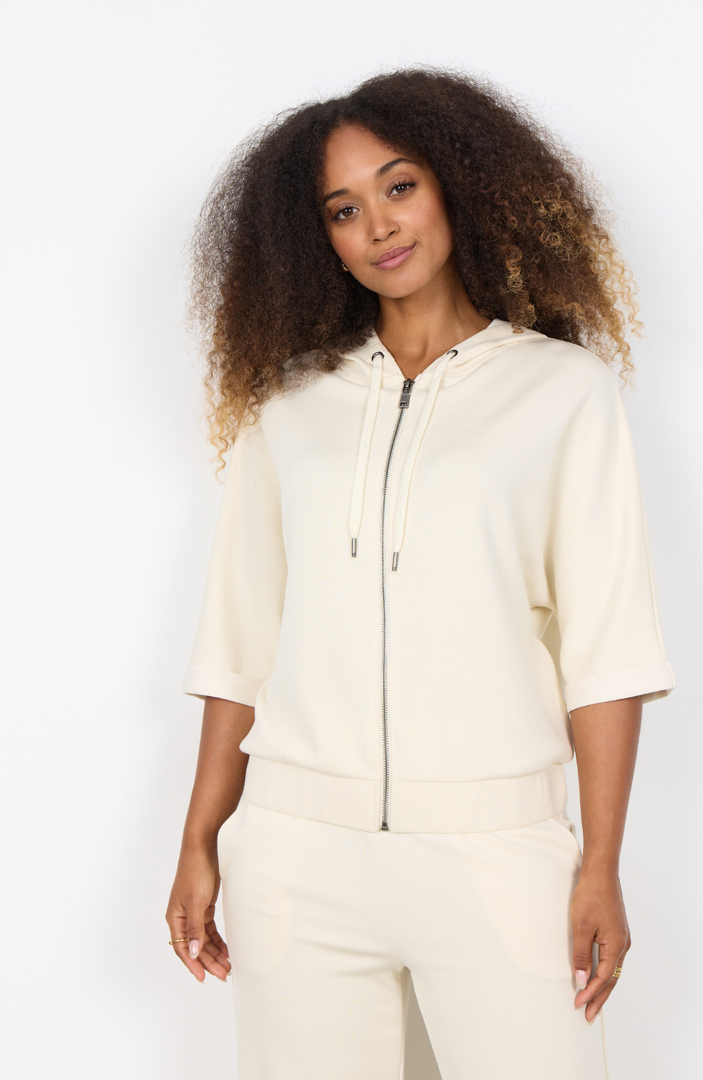 SC-BANU 282 is a stylish sweatshirt made from 48% Modal, 48% Polyester, and 4% Elastane. It has a front zip closure, a hood with drawstrings, and short sleeves with turned cuffs. This cool sweatshirt pairs elegantly with jeans.