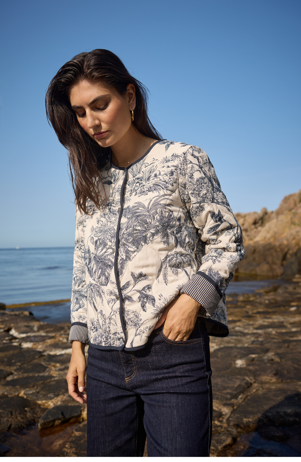 SC-CARLI 3 is a beautifully patterned jacket made from 100% LENZING™ ECOVERO™ Viscose. It includes a round neckline, front buttons, and a striking botanical print with a quilted texture and striped edging. Pair it with dark jeans for an elegant look or with a simple skirt for a unique twist.